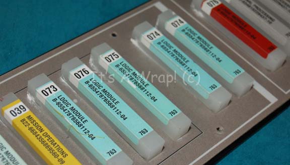 Description: A set dressing button board like those appearing variously on the set of the “Enterprise NX-01” in episodes of Star Trek: Enterprise. The item is smoked acrylic with beveled edges, a graphical application adhered to the face, a bank of rubber faux buttons, and a series of faux data card ends that are all labeled with applications and, being made from opaque plastic, will shine through if lit by an external light source. The applications on the faux data cards read ‘Logic Module’, ‘Mission Operations’, and ‘Signal Processing’. The acrylic board features screw holes for wall, console, or light box mounting and measures approx. 16 X 5.25 X 0.75 inches.