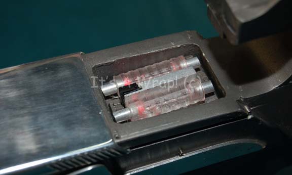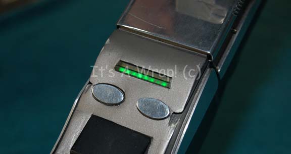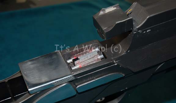 Description: A damaged, yet working hero version Starfleet Type III Mark III phaser rifle featured in Star Trek X: Nemesis. The item is a solid cast resin prop weapon with multiple working internal electronic features and metal accents. The prop is similar to previous Nemesis style phasers excepting that instead of metallic silver chrome adhesive accents the item is adorned with fashioned sheets of metal accents, some of which have lost their adhesive characteristics, but are accompanying. Multiple working battery powered electronic features are present and they are listed as a working Surfire name brand flashlight mounted into a fixed housing at the top of the stock that activates at the push of a button on the bottom of the stock, a working power readout on the stock that activates via a button switch (a line of green LEDs lights brightly across the gage from left to right, and a second red line of LEDs follows immediately thereafter), and a working trigger activates a four diodes at the barrel end and four on either side of the emission tip to create a ‘firing’ effect. The power readout gage functions on a CR 2 S sized 3volt battery, the other internal elements work on unknown batteries which still retain power from production use. Another electronic feature is the ‘power cell’ which is revealed by sliding back a metal cover plate immediately in front of the gage that is composed of a fashioned resin ‘power pack’ with translucent acrylic ‘batteries’ affixed to the top. This item is powered by a 25A sized 9volt battery (included with auction win, but kept out of housing to maintain power) that is housed internally and lights the item red, the lights do not deactivate except by way of a pressure switch that, when resting in its cavity within the weapon, should be stilled by sliding the cover over it. The weapon is also outfitted with a black nylon shoulder strap that retracts into the butt of the item. The item is painted metallic pewter with black accents, some scuffs are visible on the butt of the item and some etched scratching is apparent in the trigger guard front and on the butt end shoulder strap housing. The only major damage to the item is the scope characteristic of this version in the film is broken away from the rear of the flashlight mounting though the base mount of the feature remains and a non-functional switch as well as a yellow and a green wire is still present. The battery casing across the top of the emission end has not been opened and in fact the screws are painted into a fixed position. The item measures approx. 33 X 2 X 9.25 inches.