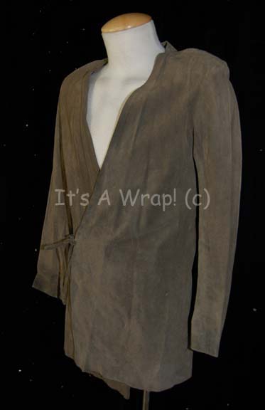 Description: A costume element featured in the ‘mirror universe’ episode of Star Trek: Deep Space Nine “Resurrection”; wherein the “Bareil Antos” from the mirror universe arrives on the station requesting asylum but turns out to be in league with the “Intendant” (Nana Visitor) to steal one of the Orbs of the Prophets.. This item is a gray, long-sleeved, suede shirt with wrap around design and a tie closure at the waist. A sewn in Deep Space Nine tag reads ‘Philip Anglim’.