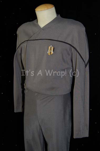 Description: A full–length gray Starfleet uniform jumpsuit made in the style of “All Good Things…”, the final episode of Star Trek: The Next Generation, to exhibit the future styling of Starfleet uniforms. This costume was featured in the final episode of Star Trek: Voyager, “Endgame”. It features black elastic stirrups at the feet, zips up the spine and clasps at the neck, a line of black piping around the shoulders, a double breasted appearance in the front and a Velcro patch on the left breast for a future-style commbadge (included but not attached), and a flesh colored, undergarment sewn into the garment. A sewn in ‘MUTO Little, Los Angeles’ tag and another tag that reads ‘Dino Maye’ are present.