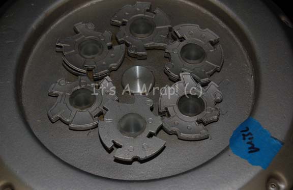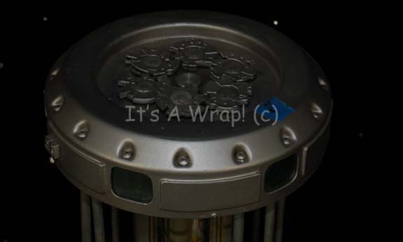 Description: A piece of set dressing similar to those featured in the Star Trek: Enterprise episode “Zero Hour” and believed to be the one featured in the episode “Minefield”. This item was featured as part of the interior mechanism of the Romulan mine that attached itself to the hull of the “Enterprise NX-01”; it has a resin cast silver-colored cylinder roughly the shape of an extremely oversized lantern featuring a graphical application on the side with Xindi script on it, an open area in the middle with several silver-colored plastic rods holding what would be the “lid” if the lantern metaphor is extended; six plastic, rod-shaped “lights” with graphical application accents around a similarly decorated metal core, a silver-colored plastic top featuring textured accents and plastic “windows” along the circumference and a group of six plastic “cog” looking aspects attached to the top of the top of the rod-shaped lights, all of which can be lifted out of the item housing like seen in “Minefield” . There are wires extending out from the bottom and the device lights up in screen caps but the electronics are untested. The item has an approx. diameter of 12 inches and a height of approx. 21 inches.