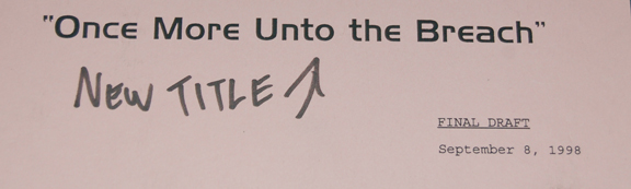 Description: A lot of three scripts all from the seventh and final season of Deep Space Nine. The first script is for the episode “Once More Into The Breach”; wherein a legendary Klingon warrior also seen in the Original Series “Kor” (John Colicos), comes to “Worf” (Michael Dorn) wanting to go into battle again. The second episode is “Field of Fire”; wherein “Ezri Dax” (Nicole de Boer) summons the memories of the murderous “Joran Dax” to help her find someone who is killing people on the station. The last episode is “The Changing Face of Evil”; wherein the Breen ally with The Dominion to attack Earth the Federation alliance is losing space, and “Kai Winn” (Louise Fletcher) begins her blasphemous slide towards the Pah-Wraiths. Each script has the episode name, draft it is, and date on the front; the aforementioned info repeated along with the episode number, director, and writer of the episode.