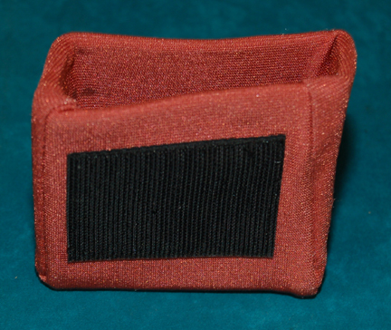Description: A prop Bajoran PADD holster like those appearing variously in episodes of Star Trek: Deep Space Nine. The item is a leather holster with rust colored spandex fabric wrapped around the exterior and a Velcro placement on the reverse. The item measures approx. 3.5 X 3.5 X 1.25 inches.