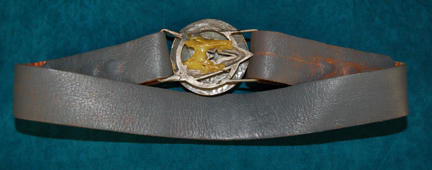 Description: A wardrobe accessory featured in Star Trek IV: The Voyage Home during the scenes involving the repair of the captured Klingon Bird-of-Prey. The item is a gray leather belt with snap ends and wrap around features for the metal belt buckle. The buckle is a molded metal Starfleet emblem turned sideways with a resin Vulcan badge adhered to the face with painted Vulcan iconography. The belt measures approx. 33 inches with some of the length kept for wrapping around the buckle ends.