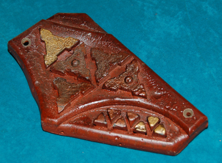 Description: A Klingon button panel made for the Star Trek: Enterprise episode “Bounty”. The item is fashioned from molded wax painted rust red with metallic gold painted faux buttons. The item features a carved out cavity in the reverse to allow for explosives to be placed and a pair of screw holes for wall mounting. The item measures approx. 8 X 5 X 1.5 inches and is slightly warped due to heat during storage.