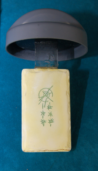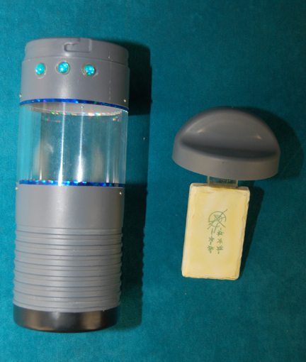Description: Kemocite is a chemical compound that has many uses depending on its level of refinement. In the Star Trek: Enterprise episode “The Shipment”, a Xindi-Arboreal colony was mining Kemocite and supplying it to “Degra” (Randy Oglesby) to aid in the construction of the Xindi superweapon. When “Gralik” (John Cothran Jr.), the Xindi-Arboreal leading the mining operation was informed by “Captain Archer” (Scott Bakula) that the Kemocite was being used to create the weapon he destroyed the shipment. The canister is made of vacuum formed gray plastic with a clear central section and a removable lid. Attached to the lid is a piece of resin Kemocite featuring Xindi markings that can be seen though the clear portion of the container. The outside of the container has metallic blue trim and three turquoise rubber buttons. Measures approx. 10 x 3 ½ inches.