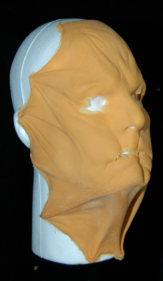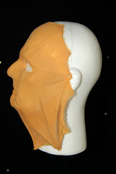 Description: An unused, unpainted special effects make-up mask like those appearing variously in Star Trek IX: Insurrection. The item depicts a face with stretched, pulled back skin, with two open eye holes, a mouth slit, and multiple wrinkles. The item is in excellent condition with supple life-like texture, defined edges, and no discoloration.