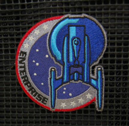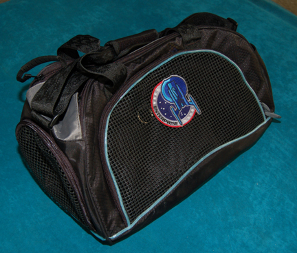 Description: A black nylon travel bag featured in various episodes of Star Trek: Enterprise like “Home” where one appeared in the possession of “Dr. Phlox” (John Billingsley) while preparing to debark the “Enterprise NX-01” for Earth. The item is a very practical travel bag with a reasonable storage capacity, several zippered pockets, mesh pockets, Velcro fastens and covers, made from durable black nylon with grey accents and blue details. The shoulder strap unclamps and the hand straps Velcro together to form one strap. The exterior of the item features a sewn on “Enterprise NX-01” assignment patch identical to the ones appearing on Starfleet uniform jumpsuits. The bottom is fortified and has affixed rugged black vinyl feet, the item measures approx. 27 X 11 X 9 inches.