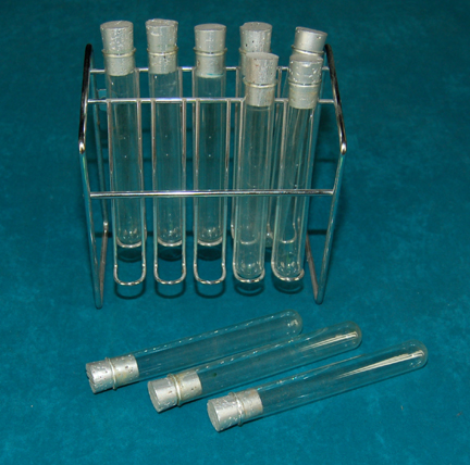 Description: A set of glass test tubes with corks and a rack appearing variously in episodes of Star Trek: Enterprise in the set of the sickbay on the “Enterprise NX-01”. The corks have all been painted metallic silver, the lot consists of ten glass test tubes, and the rack is free standing and allows for wall mounting. The item measures approx. 4.25 X 7 X 8 inches.