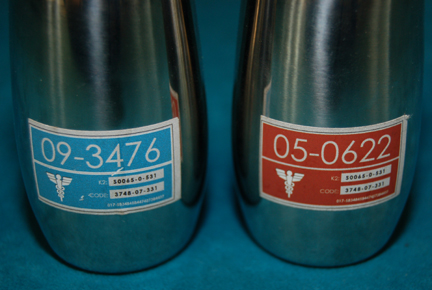 Description: A pair of lidded metal containers like those appearing variously in episodes of Star Trek: Enterprise on the set of “Dr. Phlox’s” (John Billingsley) sickbay. The items feature plastic sifters, metal lids, and a red or blue Starfleet inventory application on the side. The item s measure approx. 3.73 X 1.75 inches diameter and the lids twist into a locking position.