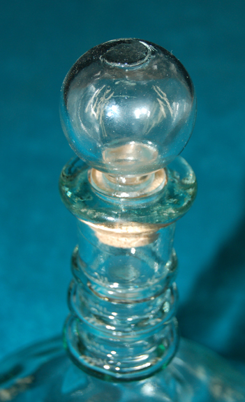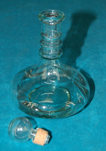 Description: A prop glass bottle like the one appearing in Star Trek X: Nemesis during the scene adjacent to the Romulan Senate Chamber between “Captain Picard” (Patrick Stewart) and “Shinzon” (Tom Hardy). The item is a glass bottle with a glass and cork stopper; the bottle is shaped wide at the base with along thin neck measuring approx. 8 X 9 inches diameter.