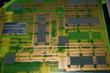 Description: A prop created for episodes of Star Trek: Enterprise that features 22nd century Starfleet inventory applications and specially silkscreened faux circuitry. The item appears as a circuitry housing that is framed in a vacuum formed frame that is painted metallic silver with multiple layers of translucent green acrylic. The item is powered internally by three AAA sized 1.5volt batteries that activate a series of blue and green positioned LEDs which light up through the acrylic. An embedded switch activates the item. Measures approx. 8 X 7 X 1.25 inches.