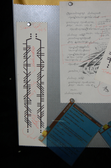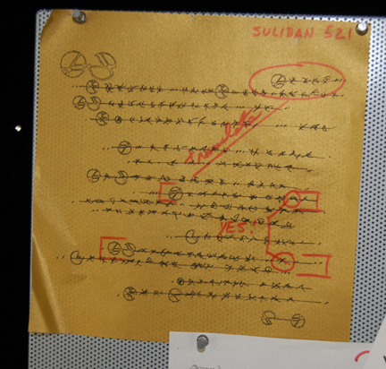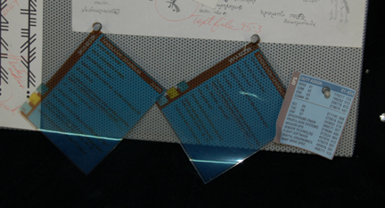 Description: A set dressing bulletin board featured in the quarters of “Hoshi Sato” (Linda Park) in episodes of Star Trek: Enterprise. The item is a silver colored metal covered bulletin board with punctures for push pins. The item is adorned with multiple pieces of set dressing ‘print outs’ that are specific to the production design of the character. The items represent multiple written language texts, one sheet includes hand written notations reading ‘Suliban’, another is a diagram of the mouth and its vocal capabilities. Three translucent PADD readouts are present with text, and a duty assignment readout in paper. The reverse of the board features positions for wall hanging and an inscription reading ‘Hoshi’. The item measures approx. 15 X 21 inches and comes with the items in the configuration on the board as it was located. Set continuity photographs verify their position as the same since production.