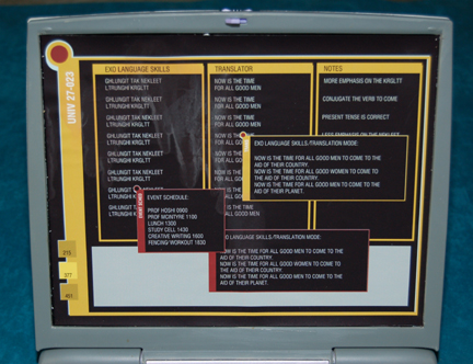 Description: A prop laptop computer featured in “Broken Bow”, the premiere episode of Star Trek: Enterprise, for use by students in “Hoshi Sato’s” (Linda Park) languages class. The item is an injection molded plastic computer learning tool for children altered for screen use in the episode. The item features a full English language keyboard, directional actuator, and ‘mouse-style’ buttons. The ‘display screen’ is covered in a graphical application depicting a futuristic 22nd century Starfleet style Windows-like program. The various windows are labeled ‘Exo Language Skills’, ‘Event Schedule’ including a listing for ‘Prof Hoshi 0900’, ‘Study Aids’, and a window listed as ‘Notes’ indicating ‘less emphasis on the NEKLEET’. The item opens on a hinged lid and when closed latches shut. The lid features a rubber faux button and the bottom features a Starfleet inventory application indicating ‘Data Com Mode’. The item still functions when powered by four AA sized 1.5volt batteries thus emitting sound when the buttons are pressed (though there is no way to navigate the screen while it is covered). The item measures approx. 10.5 X 9.25 X 1.25 inches when the lid is closed. The faint inscription ‘Oregon Scientific’ can be made out on the lid of the item.