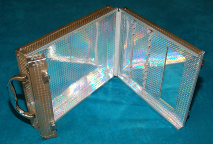Description: A prop make-up kit box appearing in the Star Trek: Enterprise episode “Acquisition” in the hands of the Ferengi “Muk” (Clint Howard). The item is a carry case with a reflective interior and exterior lining, a lid hinged in two places with flip latches and a swiveling handle. The exterior has been painted lightly to reduce on set light glare. The interior features an elastic strip made to hold items and an embedded mirror. The item measures approx. 11.5 X 8.5 X 2.5 inches.