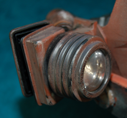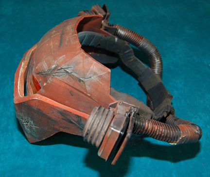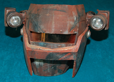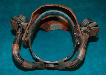 Description: A cast resin mask made in the form of a welder’s mask or a face covering for a miner on ‘Rura Penthe’, painted red with impressive distress to appear stained and worn and featuring ‘scrapes’ and ‘gouges’ placed strategically on the exterior to appear damaged. With a hinged front and a clear plastic eye covering, the item can be worn over the face on the head by way of the affixed brace and features a pair of lamps on either side that are powered by two 1.5volt AA sized batteries each, accessible by a rubber cover. One of the lamps has proven to function when twist activated.