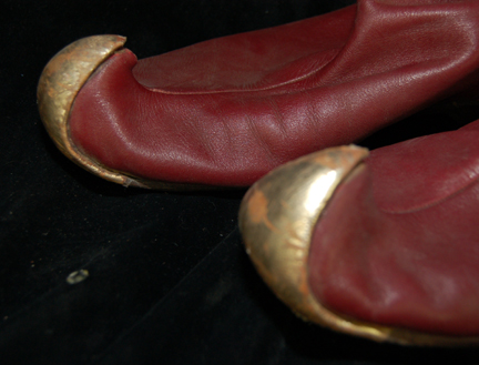 Description: A pair of red colored leather boots featured in Star Trek IV: The Voyage Home for wear by Vulcan Technicians working on the captured Klingon Bird-of-Prey. The boots very likely made appearances on Vulcan Khitomer attendees in Star Trek VI: The Undiscovered Country and could have shown up generally any other time Vulcan characters were needed in traditional costume. The boots are tall and depict use on the soles which are in fine condition, with upturned toes that are colored gold.