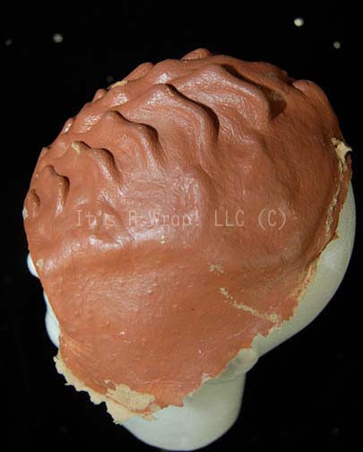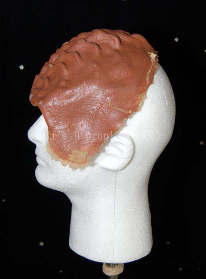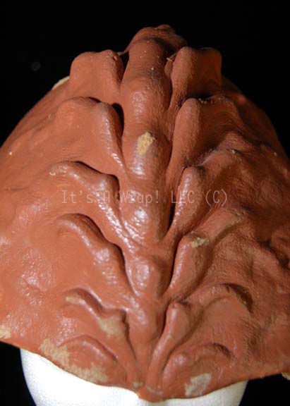 Description: A Klingon themed special effects make-up application like those appearing variously in Star Trek episodic television. The item is a Klingon forehead made from molded foam rubber and painted to match the brown flesh tone of these aliens. The item is supple and in good condition, some paint has been removed from contact with other pieces.
