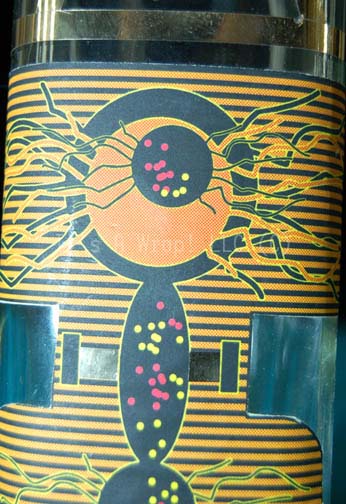 Description: A prop glass bottle like those appearing variously in Star Trek episodic television, but most frequently in episodes of Star Trek: Deep Space Nine on the set of Quark’s Bar. The item is a tall bottle with multiple lines of metallic gold adhesive detail and an alien themed graphical application. The item appears in a DVD featurette called “Secrets of Quark’s Bar” on Star Trek: Deep Space Nine Season One Disk Six where it was called an ‘Altairian Water Bottle’. Measures approx. 12.25 X 3 X 3 inches. One side of the application has lost a degree of its adhesive quality.