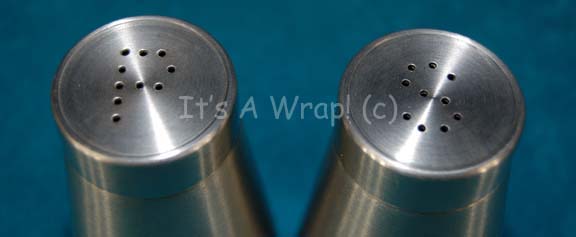 Description: A lot of two items featured in various episodes of Star Trek: Voyager. This lot consists of a set of salt and pepper shakers use in the mess hall; they match the mugs from the same series in that they are polished silver-colored metal with a screw on lid and either “S” or “P” on them to denote which is which. The items are approx. 3 inches tall and approx. 2.5 inches in diameter at their widest point.