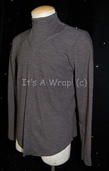 Description: A costume element featured in the Star Trek: Voyager episode “Natural Law”; wherein “Chakotay” (Robert Beltran) and “Seven of Nine” (Jeri Ryan) become trapped behind a mysterious energy barrier with a primitive society after their shuttle crashes. This item was worn by Ivar Brogger as the Ledosian doctor “Barus” who leads an expedition into the formerly sealed area where the primitive society has existed alongside his technologically race; it is a long-sleeved, dark-gray shirt featuring a false inner shirt that creates the illusion of a high collar and a zip down the front. A sewn in Voyager tag reads ‘Ivar Brugger’.