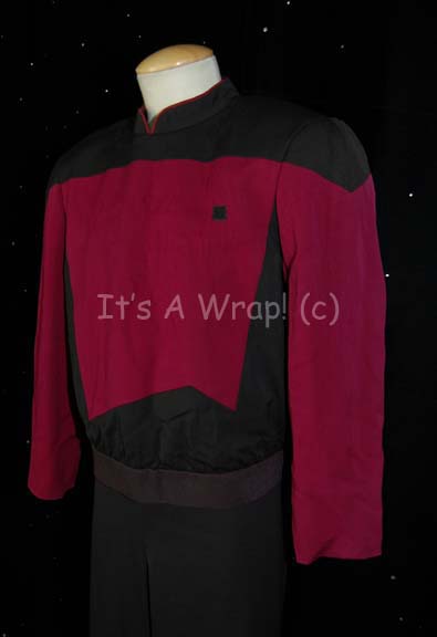 Description: A costume featured in various episodes of Star Trek: The Next Generation and reused in the seventh feature film “Generations”. This costume is just like the Starfleet uniform jumpsuit, but split into a black uniform jacket featuring Command Red chest, back, sleeves, and piping around the Mandarin collar; a Velcro placement for a commbadge (sold separately), and black overall-style trousers. A sewn in Deep Space Nine tag in the jacket is blank, a Star Trek VII tag reads ‘Mike Patpatchn’, a sewn in Voyager tag in the trousers reads ‘Mark Pash’ and a sewn in Paramount tag reads merely ‘83’.