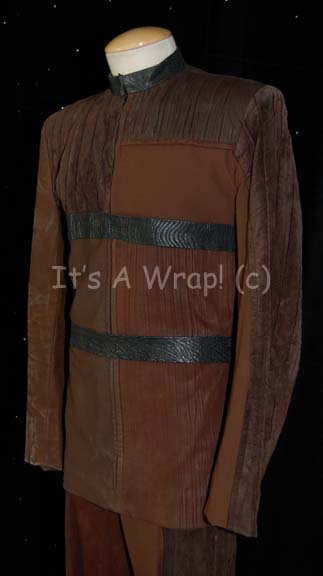 Description: A costume featured in the Star Trek: Voyager episode “Year of Hell”; wherein “Voyager” encounters an obsessed Krenim captain in command of an immense ship with the power to alter history itself and comes under almost constant attack from warships of the same race. This costume is that of a member of the Krenim Imperium military and consists of a long-sleeved jacket featuring multiple shades of brown and multiple textures of leather and suede. Three black leather straps with textured stripes; one around the collar, one across the chest, and the last around waist that attach via clasps, matching leather trousers with black fabric sewn onto the leg cuffs. The adhesive for the leather straps across the chest and waist has dried out but can easily be reapplied and still stays when clasped together. Unattached, metal rank placement is included. According to sewn in tags, this item was reused in the episode “Tsunkatse” as one of the Norcadian guards who helped an injured “Tuvok” (Tim Russ). A sewn in Voyager tag reads ‘John Austin’, a second reads ‘Erick Hunter’; a costumer’s tag reads ‘176 Voyager Year of Hell, Krenim Male, John Austin’ and a second reads ‘Erick Hunter, Norcadian Guard, Voyager #232’.
