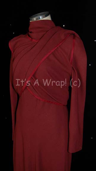 Description: A costume lot featured in the Star Trek: Voyager episode “Lifesigns” for wear by Susan Diol in the role of the Vidiian doctor and brief paramour of the “The Doctor” (Robert Picardo), “Denara Pel”. This costume consists of a long-sleeved, full-length, red dress with a high neckline, a drape of matching fabric featuring silk-like trim and attaching with a rather complicated series of snaps. The character costume was also used for the wife of the Krenim captain “Annorax” (Kurtwood Smith) in the “Year of Hell: Part II” and has a sewn in tag that reads ‘Susan Diol’ and another that reads ‘Lise Simms’. Included is a second, identical costume either for a double or stand in itself with tags denoting multiple users; a costumer’s tag reads ‘Voyager 136 Lifesigns, Danara, Susan Diol’.