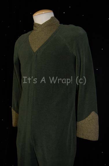 Description: A costume featured in the Star Trek: Deep Space Nine episode “Vortex”. This costume is that of the Nikahri Exarch “Hadran”, it is a long-sleeved, full-length, dark-green jumpsuit featuring raised stripes down the front, sewn in, olive-colored, corduroy dickie with a second, false collar, matching accents around the cuffs and stirrups for the feet. A blank Star Trek VII sewn in tag is present as is a costumer’s tag that reads ‘412 Vortex, Exarch Hadran , on viewscreen’.