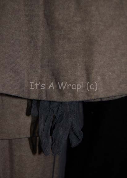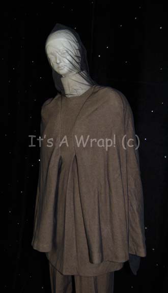 Description: A costume featured in the Star Trek: Voyager episode “Innocence”. This interesting costume consists of an olive-colored jacket featuring sheer black netting sewn onto it with a matching veil over the face; wide sleeves attached to the jacket until the elbow, further sleeves and attached gloves of the same netting, and corresponding trousers with stirrups for the feet. A sewn in Voyager tag in both items reads ‘Patrick Barnitt’.