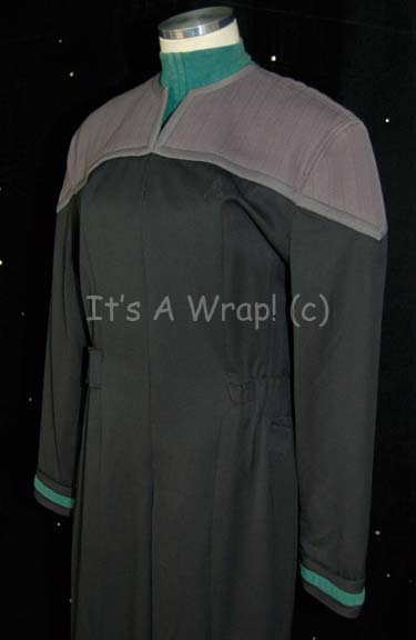 Description: A Starfleet uniform in the style that made its first appearance in Star Trek VIII: First Contact and is comprised of a full-length black jumpsuit with gray quilted shoulders, black elastic stirrups at the feet, a form fitting elastic waistband sewn inside with attached loops for ‘away team’ gear, a Velcro patch on the left breast for a commbadge (sold separately), and a Sciences Blue division stripe at the cuff. The uniform zips up the front and comes complete with a separate sleeveless undershirt matching the division cuff color that zips up the front and has very slight discoloration under the arms. Uniforms like this were also seen in Star Trek: Deep Space Nine after the episode “Rapture”, in late seasons of Star Trek: Voyager, and Star Trek IX: Insurrection but this one was featured in Star Trek: Nemesis. A sewn in tag in the jumpsuit reads ‘Roger Raskin, 045’ and a costumer’s tag restates this.