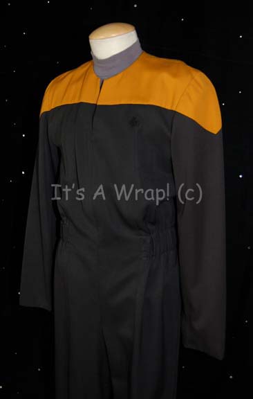 Description: A costume featured in various episodes of Star Trek: Voyager like “Scorpion” and “Twisted”. This costume is for wear by regular extra and Robert Beltran stand-in Richard Sarstedt as the recurring “Crewman William McKenzie”, it is a black Starfleet uniform jumpsuit with Operations gold division shoulders that zips up the front, clasps at the top, and features a Velcro placement on the left breast for a ‘commbadge’ (sold separately). The waist features form fitting black elastic with sewn in loops for ‘away team’ gear, the feet end in black elastic stirrups. The costume comes with a gray turtleneck undershirt that zips up the back. A sewn in Voyager tag in both items reads ‘Richard Starstedt’; a second tag in the undershirt sets its size at 38 and a costumer’s tag restates the information of the first tags.