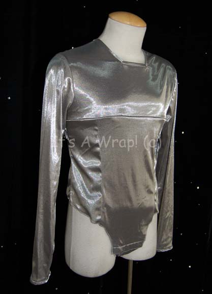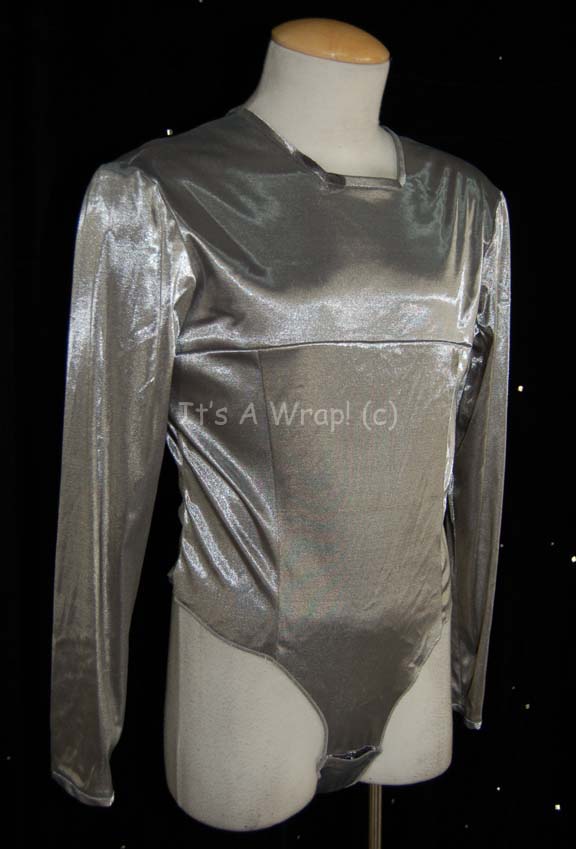 Description: A lot of costume elements featured in the Star Trek: Voyager episode “Body and Soul”; wherein “Seven of Nine” (Jeri Ryan) is forced to download “The Doctor’s” (Robert Picardo) program into her cybernetic implants to save him from being decompiled by holo-phobic aliens called the Lokirrim. This lot consists of four metallic-silver colored shirts with zips down the back; three of the shirts are long-sleeved, one short and have varyingly-shaped collars. A sewn in Voyager tag in one denotes it as for wear by Megan Gallagher as “Jaryn”, two have tags denoting wear by Fritz Sperberg as “Captain Ranek” who was unknowingly romancing “The Doctor” (Robert Picardo) in the body of “Seven of Nine” (Jeri Ryan), and the last denotes wear by veteran Star Trek stunt man “Tom Morga”.