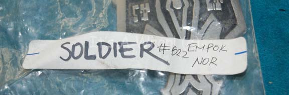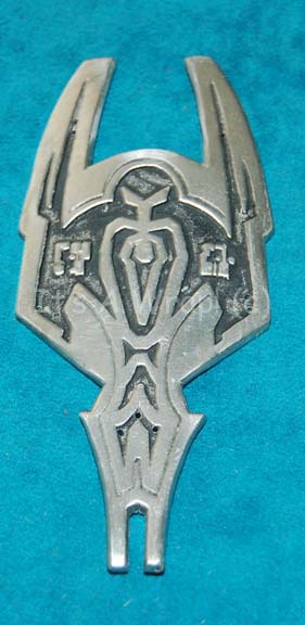 Description: A silver colored metal badge featured in the Star Trek: Deep Space Nine episode “Empok Nor” for wear on a Cardassian soldier uniform shoulder. The item depicts the iconic symbol of the Cardassian Union with what appears to be upturned wings and some iconographic lettering bracketing the item. The markings are inset and colored black for depth and minute thread holes are evident for stitching into a costume. The item measures approx. 4.5 X 2 inches and was located in a bag labeled ‘Soldier #522 Empok Nor’ which accompanies the item. This lot contains the last known badge of this configuration, no further badges like this are expected to be located.
