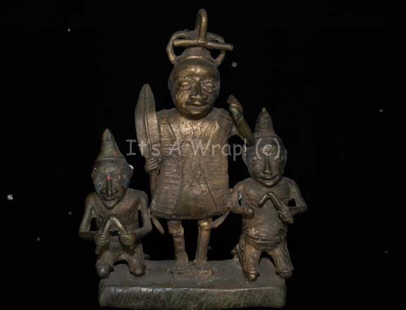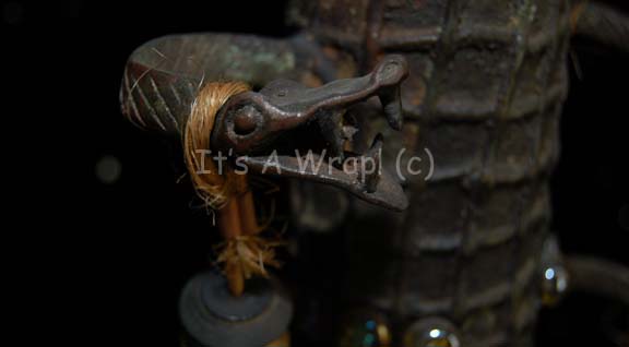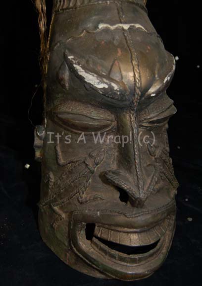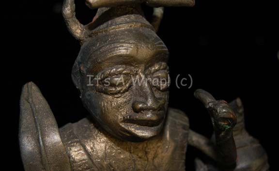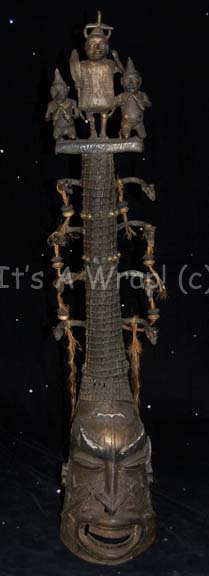 Description: A piece of set dressing featured in the Star Trek: Enterprise episode “Home”. This item was used in the home of “T’Les” (Joanna Cassidy), mother of “T’Pol” (Jolene Blalock), and consists of a metal totem-like statue featuring a large, stylized Vulcan face as its base and a stalk growing out of it with which ‘snakes’ grow out from the sides, black and gold-colored beaded accents hang from the ‘snakes’ by woven rope, and pearl-like faux jewels. The top has a platform with which two stylized Vulcan figures kneel on either side of a central, standing figure brandishing what looks like a large feather. The item has a bronze-like finish and is lightly distressed for effect. The item measures approx. 11 X 8.5 X 48.5 inches.