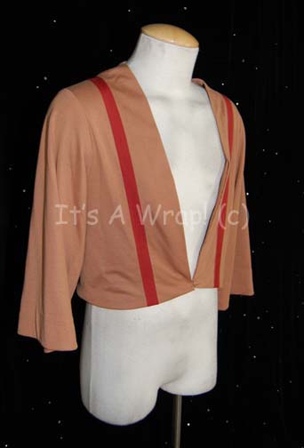 Description: A costume element like those featured in the first Star Trek feature film. This item is a long-sleeved, cropped, brown shirt with red stripes, a neckline that closes only at the bottom of the garment via a single clasp.