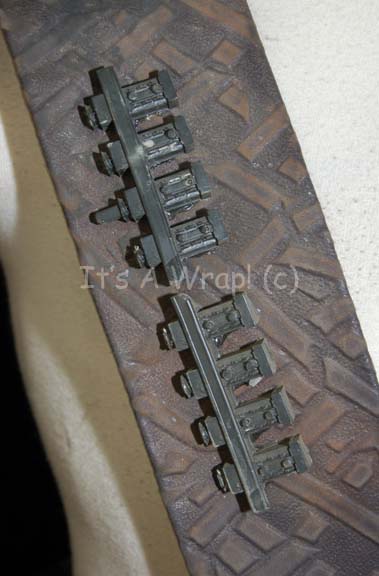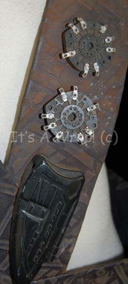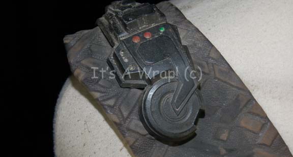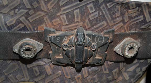 Description: A costume element featured in the Star Trek: Voyager episode “Memorial”; wherein certain members of the crew start having dreams and visions of fighting in a horrific war centuries past. This item resembles the belt/harnesses worn by Jem’Hadar soldiers in DS9 in that they are made of the same dark-gray leather and have the same lighter-colored “X” pattern. This item has a large Velcro placement on the inside front and a black belt that clasps attached to the harness. A label on the belt reads ‘Gary Franks’.