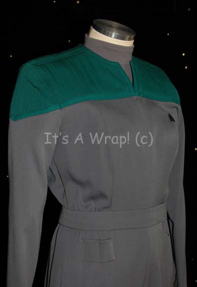 Description: A costume featured in the Star Trek: Deep Space Nine episode “Valiant”; wherein “Jake Sisko” (Cirroc Lofton) and “Nog” (Aron Eisenberg) are rescued from some Jem’Hadar by the Starship “Valiant”, a Defiant-class ship manned completely by members of the elite Red Squad cadet group. This costume is the Starfleet cadet’s uniform consisting of a long-sleeved, full-length, gray jumpsuit featuring quilted shoulders with Sciences Blue division colors and further division strips around the cuffs; a Velcro patch for a commbadge (not included) on the left breast, hoops for tools on the waist, pockets on the legs, a matching belt, stirrups for the feet, and a gray-blue, long sleeved undershirt. A sewn in tag on the jumpsuit and undershirt denote wear by ‘Grace Bustos’ and an attached costumer’s tag restates the same.