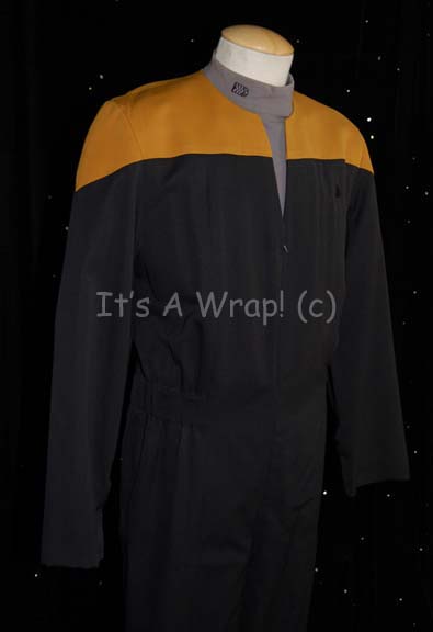 Description: A costume featured in various episodes of Star Trek: Deep Space Nine. This costume is for wear by Colm Meaney in his portrayal of the beloved everyman and the who, more than anyone else, kept the station of Deep Space Nine running, “Chief Miles O’Brien”, a black Starfleet uniform jumpsuit with Operations Gold division shoulders that zips up the front, clasps half way up the chest, and features a Velcro patch on the left breast for a Starfleet ‘commbadge’ (sold separately). The waist features form fitting black elastic with sewn in loops for ‘away team’ gear, the feet end in black elastic stirrups. Included is a long-sleeved, blue/gray uniform undershirt with a zip up the front with a non-commissioned rank placement on the right side of the collar equivalent to “Senior Chief Petty Officer”. Both undershirt and jumpsuit feature sewn in Deep Space Nine tags that denote wear by ‘Colm Meaney’ and the attached costumer’s tag restates this.