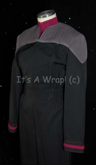 Description: A Starfleet uniform in the style that made its first appearance in Star Trek VIII: First Contact and is comprised of a full-length black jumpsuit with gray quilted shoulders, black elastic stirrups at the feet, a form fitting elastic waistband sewn inside with attached loops for ‘away team’ gear, a Velcro patch on the left breast for a commbadge (sold separately), and a Command Red division stripe at the cuff. The uniform zips up the front and comes complete with a separate sleeveless undershirt matching the division cuff color that zips up the front. Uniforms like this were also seen in Star Trek: Deep Space Nine after the episode “Rapture”, in late seasons of Star Trek: Voyager, Star Trek IX: Insurrection, and Nemesis. A sewn in tag in the jumpsuit denotes use in DS9 and Star Trek: Nemesis whereas the undershirt denotes use in only DS9.