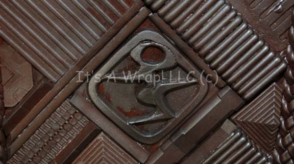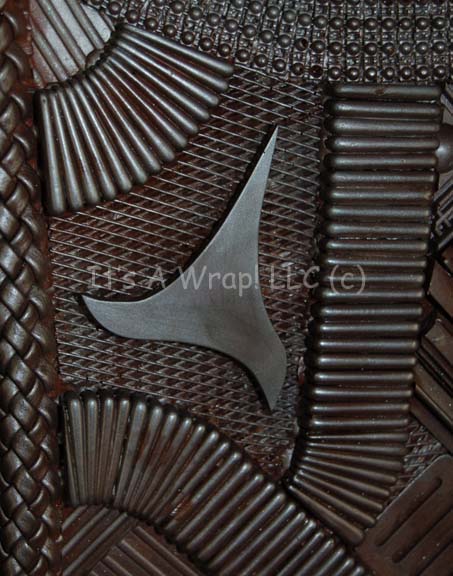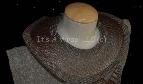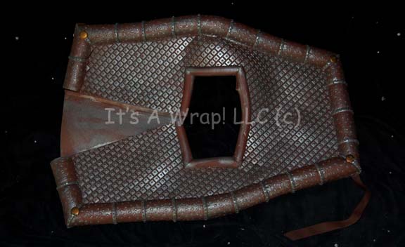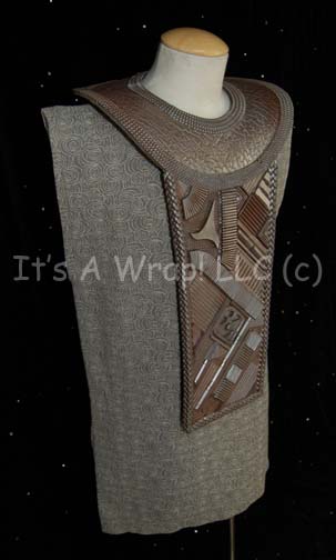 Description: A lot of costume elements featured in the sixth Star Trek feature film “The Undiscovered Country”. A large sleeveless, gray tunic featuring a textured, circular pattern stitched in white and worn underneath one of two ceremonial tabard/armors. The first is a large molded rubber costume embellishment that covers the entire front of the wearer’s body excepting the arms. It wraps around the neck with a circular clasp and hangs down over the body. Two familiar Klingon accents are present on the item, one: a Klingon unit badge molded from rubber adhered into a position on the front, and two: a Klingon Empire emblem is molded immediately into the rubber of the item itself. It is adorned with multiple molded textures and accents. The Velcro adhered into the neck piece has lost its adhesive quality. The second item is of the same rubber but is quasi pentagonal, featuring a large trim around the sides, a hole in the middle for the head with its own trim; most of its surface is covered by a raised, ‘studded’ pattern and also features a triangular area bereft of adornment. Due to time and storage, the rubber items have incurred some degree of fading and damage but all are generally in good shape.