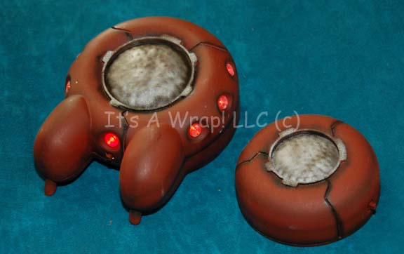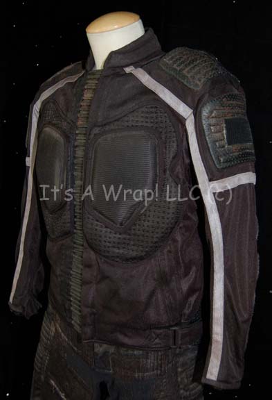 Description: A costume featured in the Star Trek: Enterprise episode “Anomaly”; wherein the “Enterprise NX-01” is attacked by pirates called “Osaarians”. This costume consists mostly of components garnered from motorcycle wear; a long-sleeved, black jacket featuring multiple sites of reinforced padding, black, textured rubber accents, matching trousers with painted on distress to appear aged. A cast resin ‘transporter’ device affixed to the right sleeve by Velcro that lights up in two places when activated by either of its two switches; a smaller ‘transponder’ for beaming cargo off of ships, made in the same style but with only a single light on the opposite end as the activation button. The costume features name brand labels by ‘First Gear’ and a sewn in Enterprise tag in the trousers that reads ‘Aaron Pedrin, episode 43’.