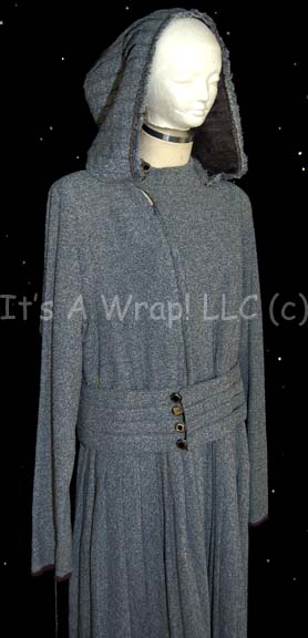Description: A costume featured in the Star Trek: Enterprise episode "Cold Front"; wherein the “Enterprise NX-01” crew takes on pilgrims hoping to witness a stellar event called “The Great Plume of Agosoria” and “Captain Archer” (Scott Bakula) finds out a member of his crew is not who he appears to be. This costume is that of one of the pilgrims come to view the Plume; a hooded, full-length grey-blue robe that zips down the front, has a button and clasps at the neck, and black, metal faux’ jewels’ on the belt and collar. One of the faux jewels came out of its housing on the belt but is included for easy reattachment.