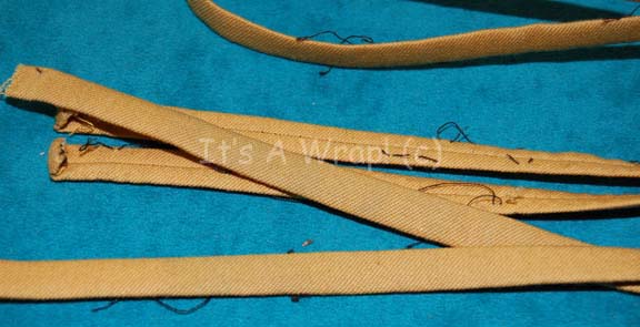 Description: A pair of fabric strips featured on the costume trousers of Starfleet uniforms in Star Trek feature films. The items are folded over and stitched sealed; meant to be sewn onto the outside seam of trousers to indicate the wearer to be a member of the operations division. The items are 43 inches long and retain threads from removal.