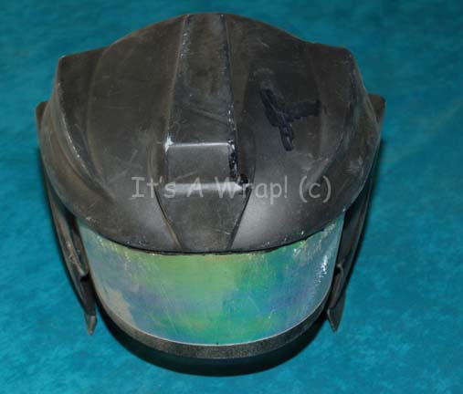 Description: A costume helmet featured in the Star Trek: The Next Generation episode “Suddenly Human”. The item is thin black vacuum formed plastic with an iridescent, translucent visor and an internal mounting band connected to a black elastic chin strap. The item depicts some shelf wear due to time and storage conditions and measures approx. 11.5 X 11 X 10.25 inches. Item Numbr 9430