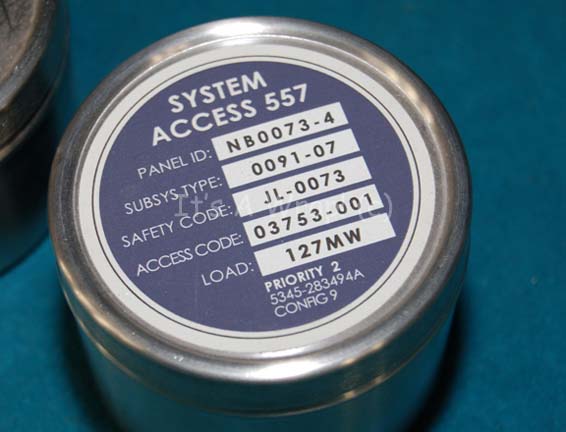 Description: A pair of set dressing containers appearing variously in episodes of Star Trek: Enterprise on the Sickbay set. The items are metal containers with removable lids that measure approx. 1.75 X 2 inches diameter. Both items feature Starfleet inventory applications colored blue with white cadesus graphics, one lid features a purple colored ‘System Access’ application that is applied to the lid inset.