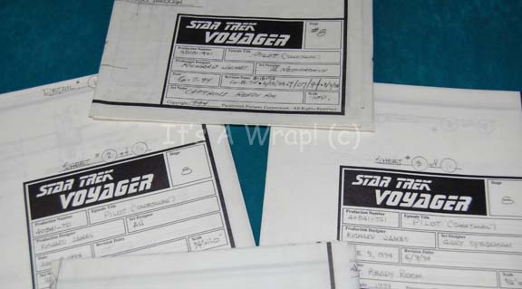 Description: A lot of schematics for sets featured in the pilot of Star Trek: Voyager and episodes afterwards. These schematics include desk and room layout details and are labeled either “Captains Ready Room” or “Int. Ready room”. These items feature information like the show name, stage, and production number, original date, set name, production and set designer on a panel in the lower right hand corner.