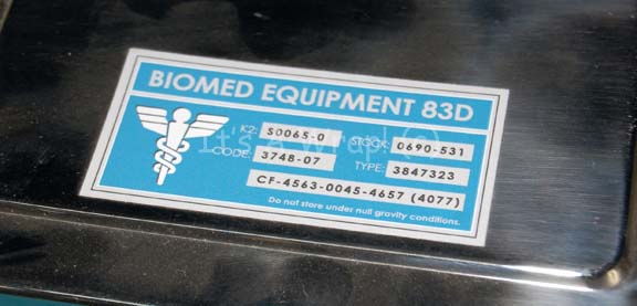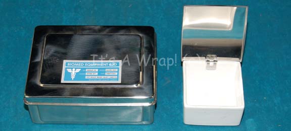 Description: A pair of lidded boxes appearing as set dressing in the sickbay set in various episodes of Star Trek: Enterprise. The items are one metal container with a matching metal lid that features a blue colored Starfleet inventory application depicting a white cadesus and labeled ‘Biomed Equipment 83D’, and a white ceramic box with a spring clasp metal lid that features a Starfleet inventory application. The ceramic box is labeled ‘Beehouse, Japan’ on the base. The items measure approx. 3.25 X 3.75 X 2.5 inches and 8 X 6 X 3 inches. Both Starfleet inventory applications instruct ‘Do not store under null gravity conditions’.