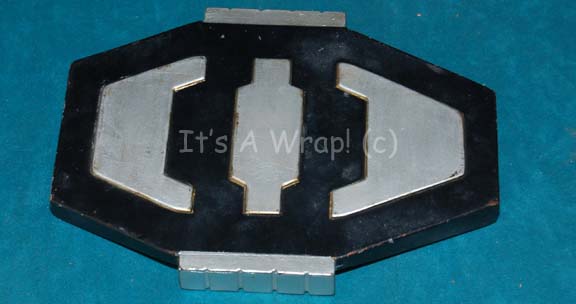 Description: A PADD (Personal Access Display Device) featured in the episode “Borderland” of Star Trek: Enterprise. The item is solid cast resin with an elongated octagonal shape, painted black with metallic silver painted inset and highlight accents and a round centered ‘display screen' with a reflective graphic depicting ‘Orion’ character letters meant to exhibit selections and prices at a slave auction during scenes in the episode. The item measures approx. 7.25 X 5 X .5 inches.