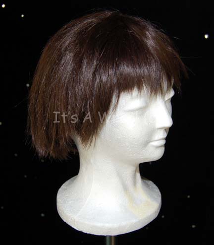 Description: A Romulan costume wig like those appearing on senator characters in Star Trek X: Nemesis. The item is a brown colored synthetic wig in excellent condition made for a female wearer. A sewn in manufacturer’s tag gives the brand name as ‘Elura’. The item was located in a zip seal bag labeled ‘Brown, Synthetic, Romulan’.